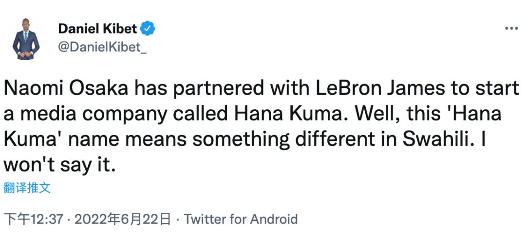 一名乌干达记者在推特上面表示,“大坂直美与勒布朗詹姆斯合作创办了一家名为 Hana Kuma 的媒体公司。嗯,这个‘Hana Kuma’这个名字在斯瓦希里语中的意思是不同的。我不会说出来”此外,也有不少网友将这个名字描述为"不道德的"和"露骨的"。