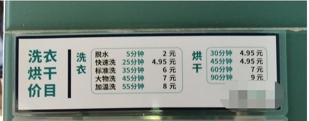 在洗衣机的旁边,贴着收费、烘干衣服的价格,费用精确到分钟。古婕几乎不用烘干功能,“烘干最少得30分钟要5块钱,洗衣服25分钟也才5块钱”。