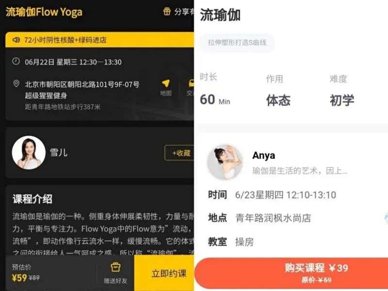 以北京地区为例,截至发稿,同样是流瑜伽课程,在记者拥有优惠资格的前提下,超级猩猩预估价为59元(原价89元),乐刻价格为39元(原价为59元),Keepland价格则为49元。