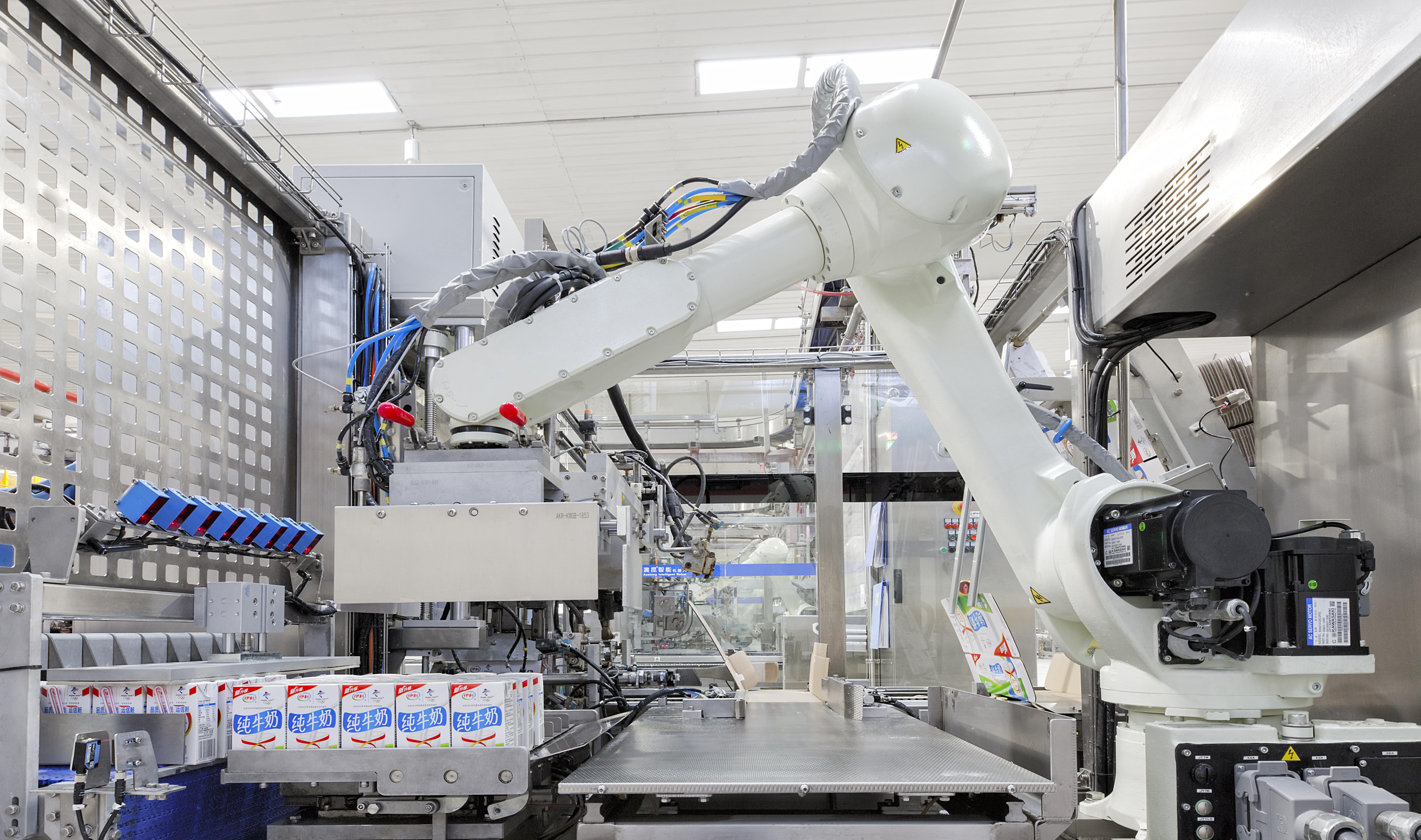 在自动化生产线上,智能机器人无缝配合,从生产线到质检、包装、自动化生产线、智能化机器人、生产、抽检、灌装、装箱、码垛一气呵成。截至目前,伊利全国所有工厂均实现了智能化布局。