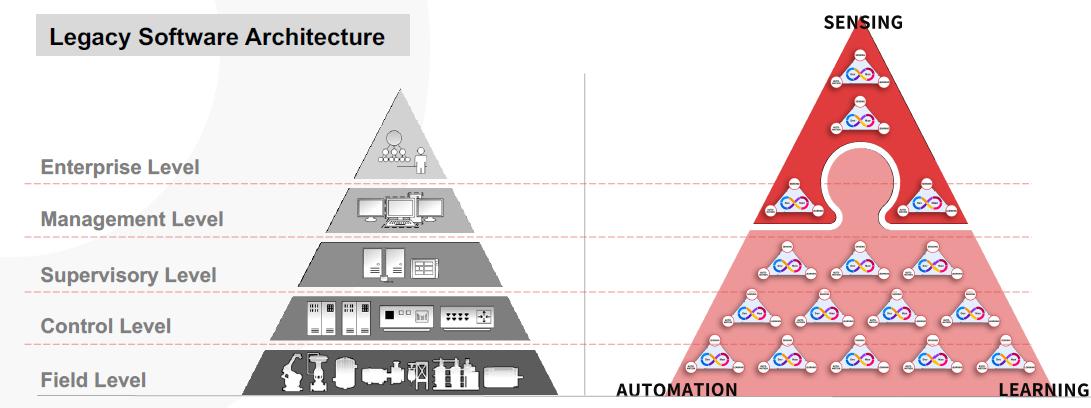 在Industrial Next的生产架构中,MES-MOS软件系统是作为全局统筹者的角色存在的,预计该软件系统可以根据实时物料情况和各个工作站的生产情况来实时规划和调度生产任务,指导制造单元和生产线的生产,而各个分散独立的工作站可以随时柔性化地和其他工作站组合成一个整体完成上层软件分发的生产任务。这意味着Industrial Next希望帮助整车厂商可以不再沿用传统的现场-控制-监控-管理-规划的五层网络架构,而是采用只有决策-执行两层的生产网络架构,进而提升整个工厂的自主性和智能化柔性化水平。