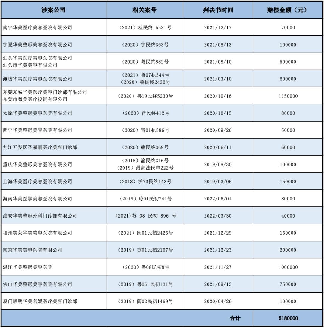 公开判决书显示,东莞东城华美医疗美容门诊部有限公司(下称“东莞华美”)、湛江华美、佛山华美、汕头华美医疗美容医院有限公司和汕头市华美美容有限公司(下称“汕头华美”)分别被判赔偿115万元、100万元、75万元和50万元,其他地区的华美医院赔偿金额为4万元-20万元不等。