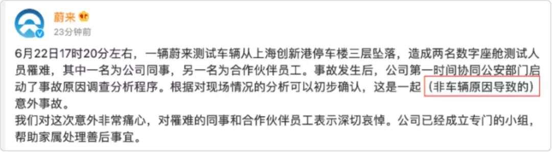 6月23日,“蔚来汽车被曝冲出总部大楼坠落”的话题登上微博热搜。事故发生于6月22日下午5点,位于上海嘉定蔚来汽车总部,一辆蔚来测试车从高空坠落,车上两名试车员不幸身亡。当晚蔚来公开发布的回应,被网友指责称“太过于冷血”。蔚来连夜更改了表述,将声明中“这一场意外事故,与车辆本身没有关系。”改为了“这是一起(非车辆原因导致的)意外事故。”