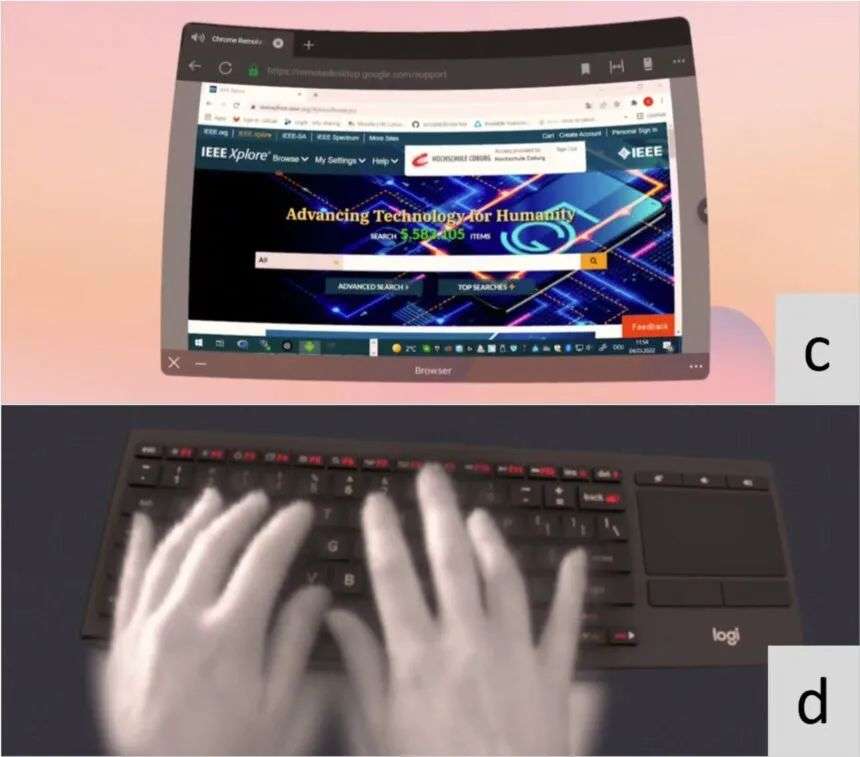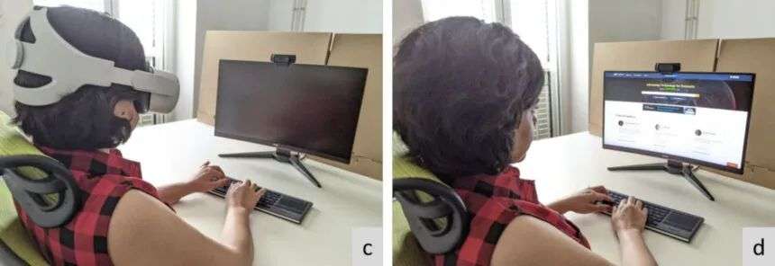 为了让 VR 测试环境和真实环境贴近,团队使用了流行的 Meta Quest 2 VR 头显,并在虚拟环境中设置了一个类似曲面屏的虚拟屏幕,同时使用头显的 see-through 功能,让受试者可以看到现实中的物理键盘进行输入;在现实环境中,则是一台 PC,配一台真实的曲面屏幕。