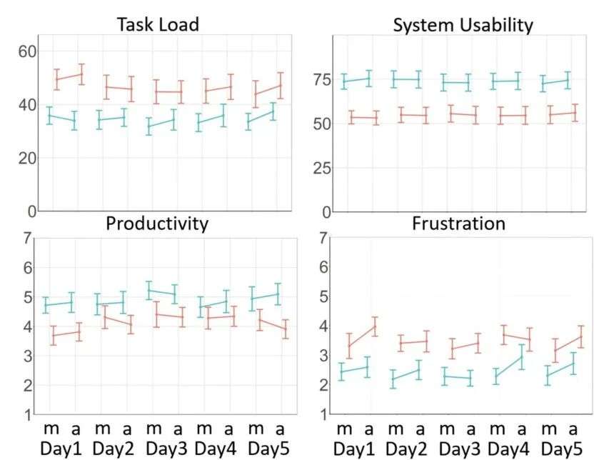 一周之后,团队得出实验结果,不论是从工作量、系统可用性、工作产出还是挫败感来说,VR 环境的成绩都比物理环境要低。同时,在 VR 中工作带来的挫败感更大,更容易产生不适和焦虑,更不用提视觉疲劳要比物理环境大得多。