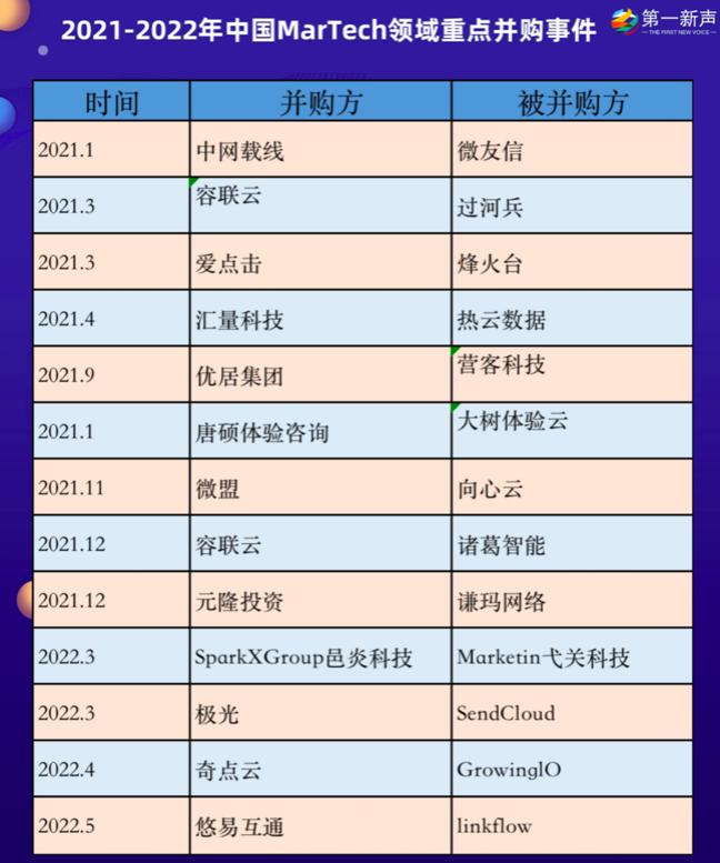 而并购这个有意思的现象同样也正发生在国内Martech市场上。第一新声观察到,从2021年下半年开始年,国内MarTech行业发生多起并购事件。例如3月份,新生代数字营销科技公司“SparkX Group邑炎科技集团”宣布战略并购Marketin弋关科技;4月11日,奇点云并购了GrowingIO;5月份,悠易互通收购linkflow。
