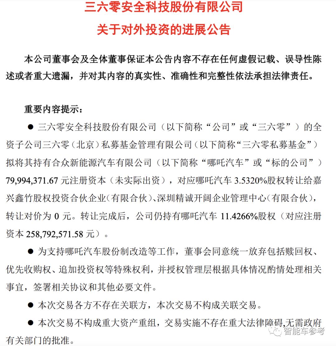 360:我,哪吒汽车众所周知的外部大股东,之前承诺要投29个亿,现在情况有变,剩余的10个亿不兑现了,平价转出……原因是配合团队股改。