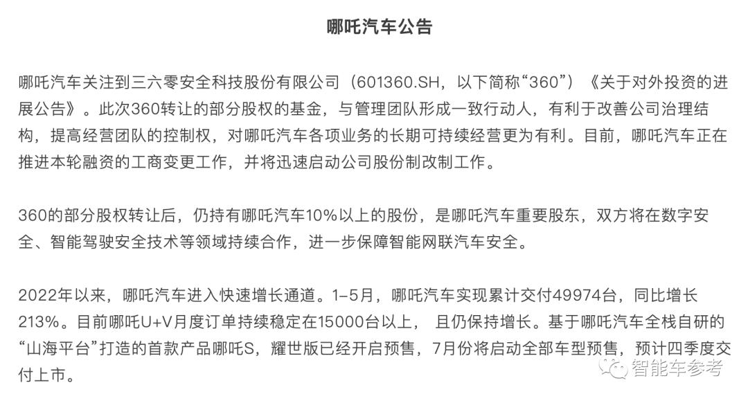 因为在与去年360和哪吒汽车签订投资协议时,已经部分透露了哪吒汽车的股权结构。