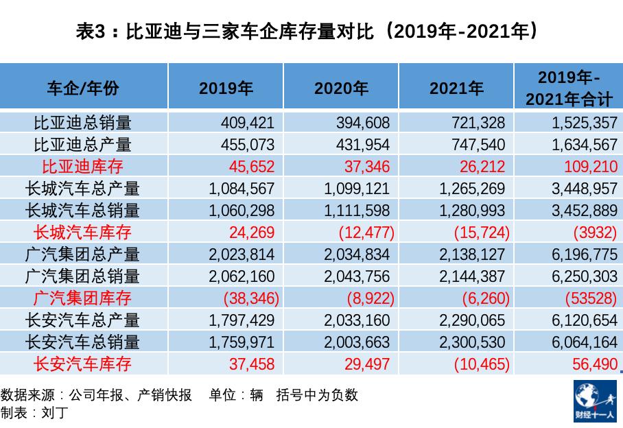 2019年市场疲软,比亚迪、长城汽车、长安汽车都积累了库存车。长城汽车在2020年和2021年销量多于产量,消化了不少库存车,得以保持3年间的产销平衡。比亚迪则是连续3年高额库存。