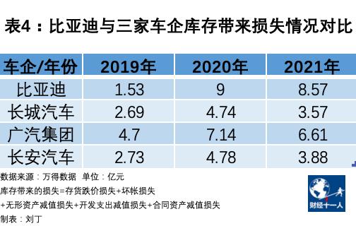 根据《财经十一人》测算,2020年到2021年,比亚迪的存货跌价损失、开发支出减值损失、无形资产减值损失、合同资产减值损失(计入资产减值损失项目),导致比亚迪净利润率降低了0.5个百分点和0.4个百分点。