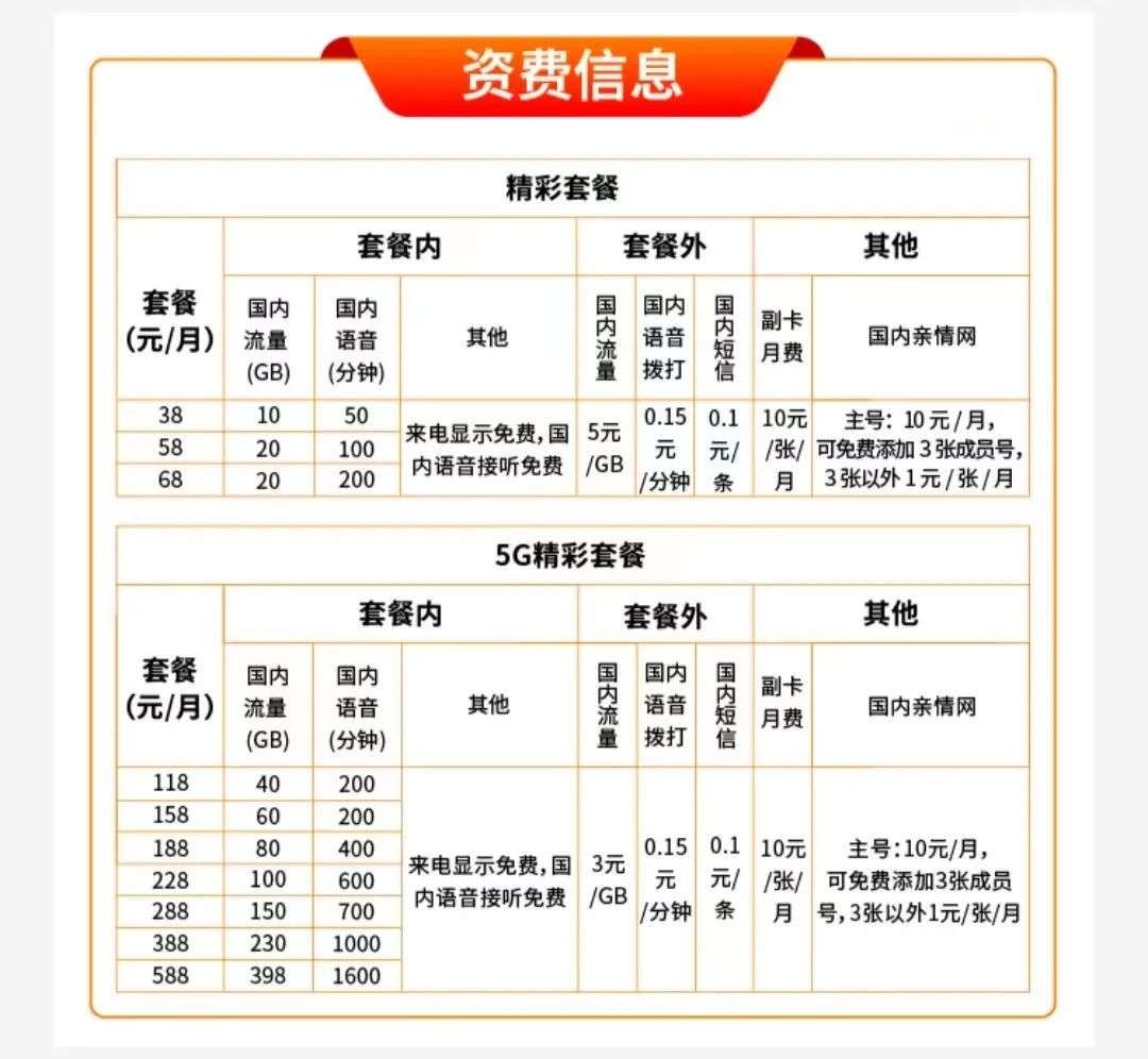 中国广电的套餐分为两类,“精彩套餐”和“5G精彩套餐”,前者门槛低主打“经济、实用、高性价比”,后者门槛相对较高,主打“超大流量”。中国广电此次推出的套餐共计10档,最低月租为38元,包含10GB流量+50分钟通话时长,最高月租为588元,包含398GB流量和1600分钟通话时长。