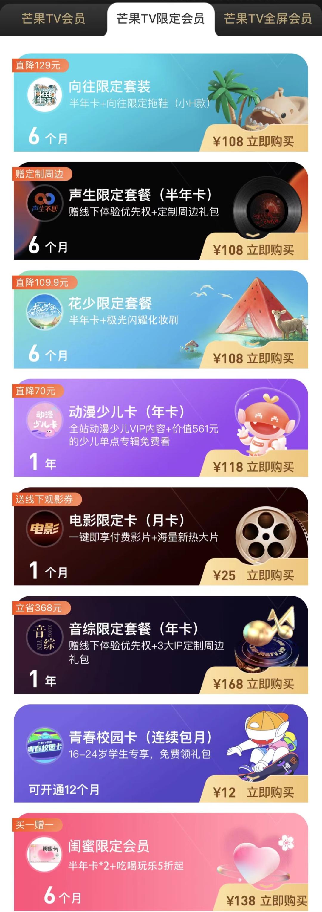 不过第二种类型则大概是芒果TV的一次独创尝试,基于某一平台核心类型内容打造的会员,比如全新推出的“音综限定套餐”。