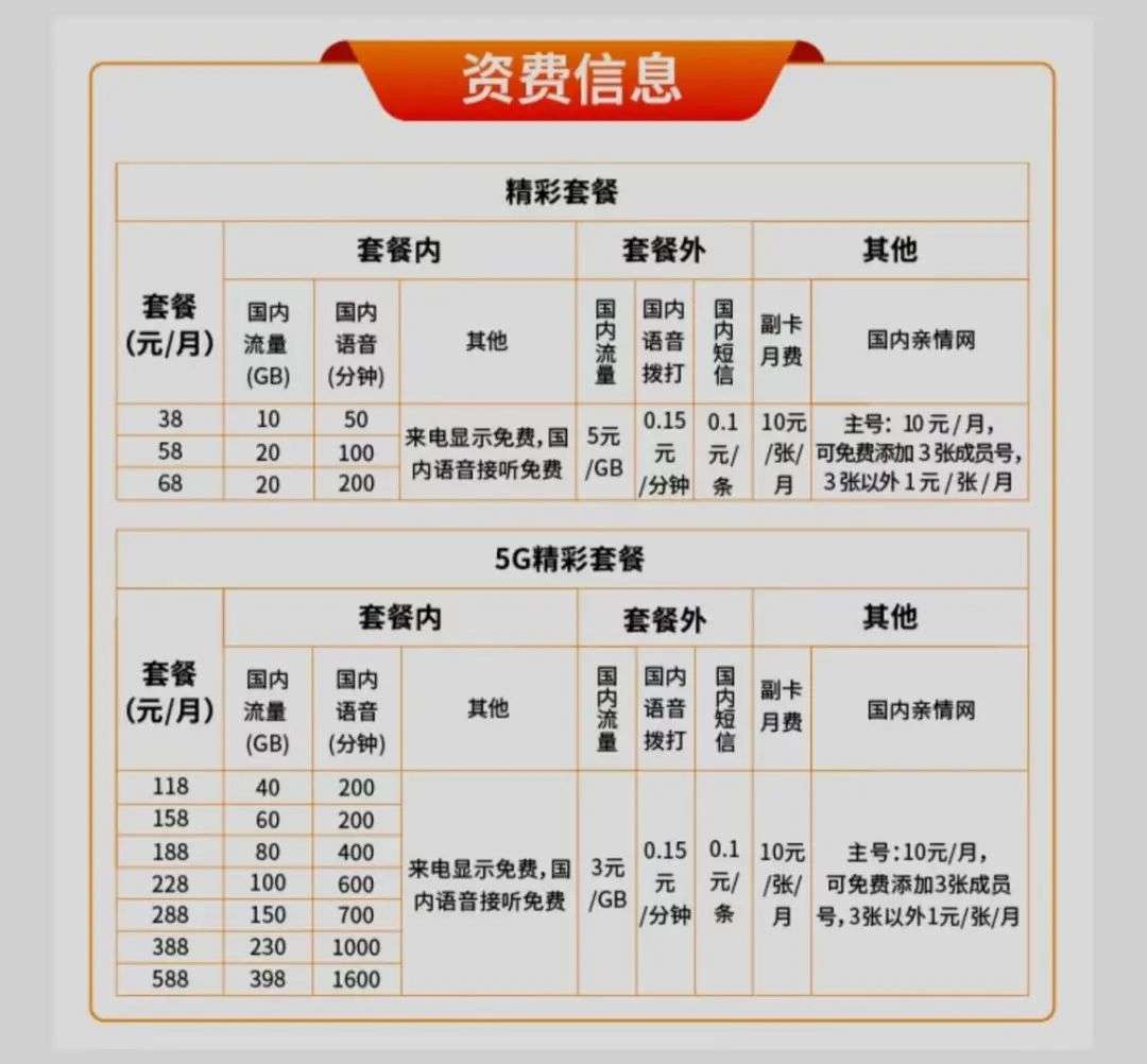 中国广电在官网公布了“精彩套餐”和“5G精彩套餐”两类可供选择,每月资费分别为38元起和118元起。