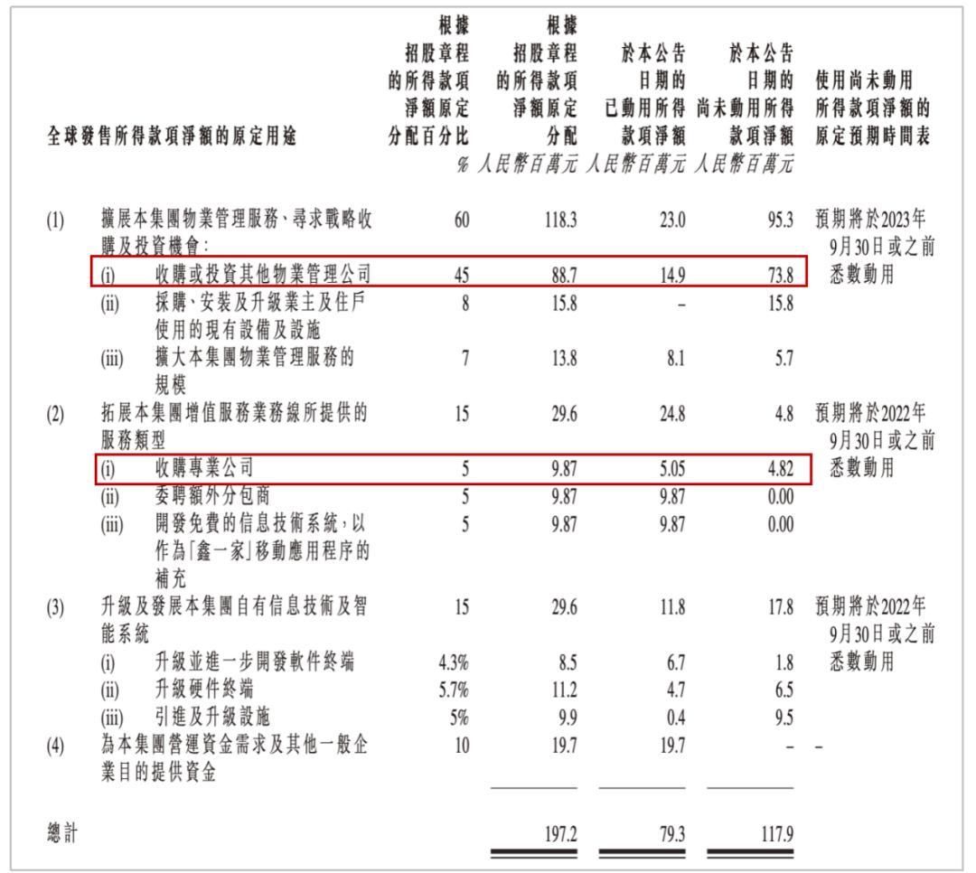 事实上,截至公告之日,鑫苑服务IPO募资中,用于扩展集团物业管理服务、寻求战略收购及投资机会的资金还有9530万元。