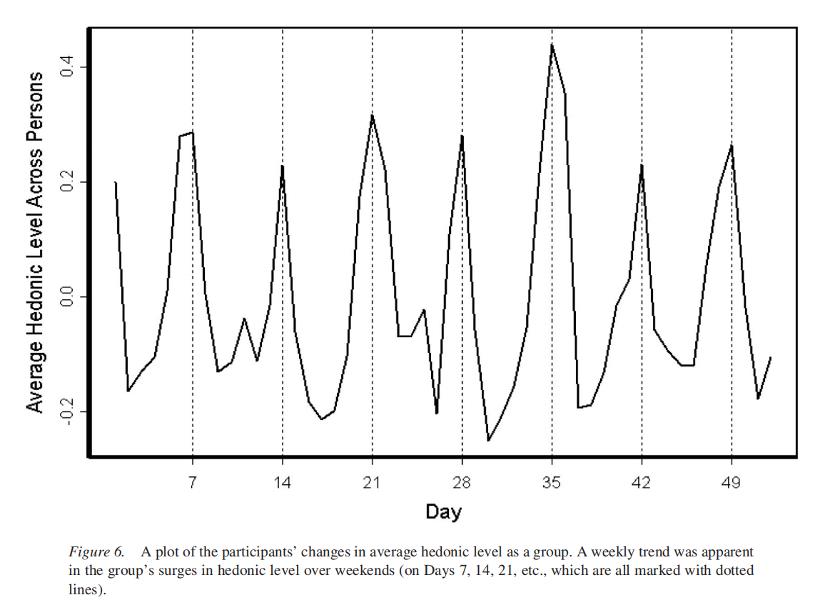图说:在一项美国的研究中,研究人员连续测量了179名大学生的情绪水平,结果发现,他们的情绪平均水平呈现规律性的波动,变化周期刚好是一周,其中周一的情绪最消极,周六的情绪最积极|参考文献[1]
