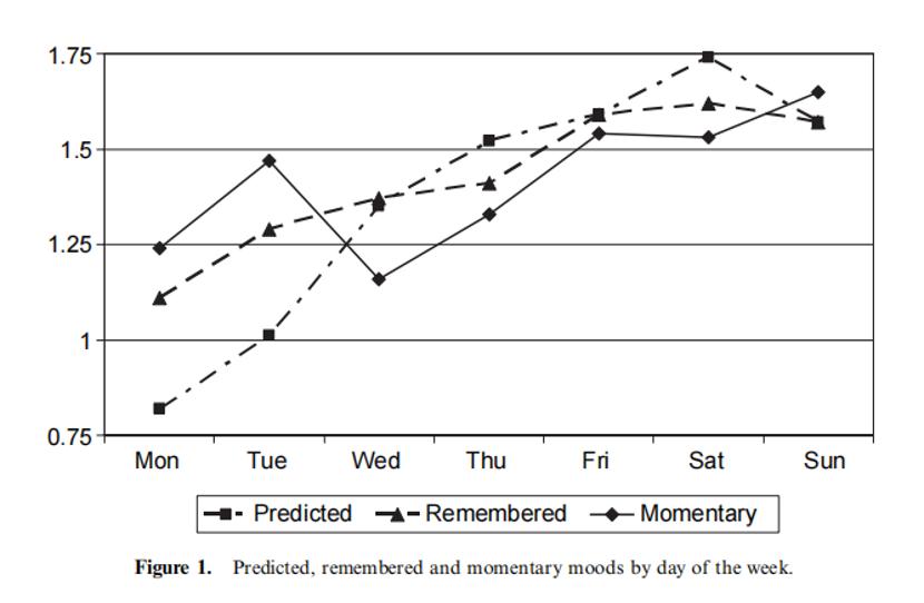 人们在预测和回忆时往往出现偏颇,以为周一周二非常痛苦,但实际上当天你的心情可能还是不错的|参考文献[7]