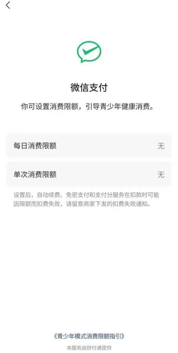 现在父母或监护人可在青少年模式中设置微信支付的限额,包括“每日消费限额”和“单次消费限额”。完成设置后,青少年使用微信支付时,将会受到已设置的额度限制。