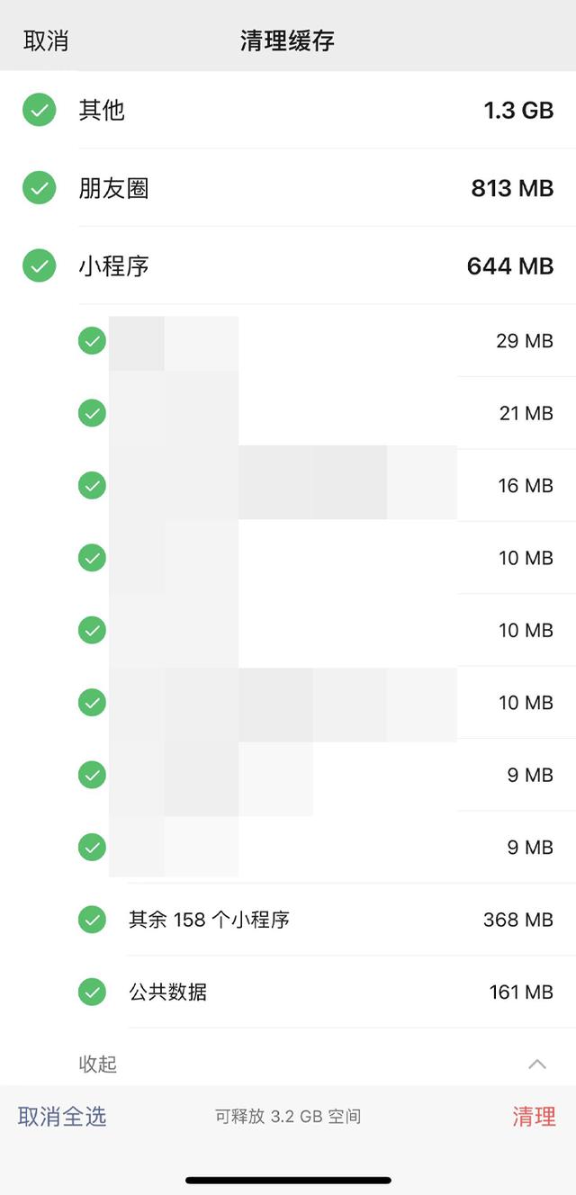 和以往点一下也不知道微信在清理什么缓存不同,现在点击“前往清理”后,大家可以自由选择清理小程序、视频号、朋友圈、收藏当中的缓存内容,朋友圈照片“黑历史”一键说拜拜~