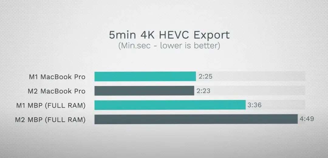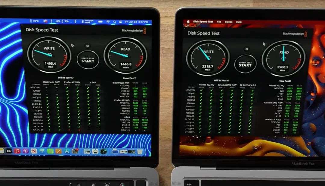 另外,YouTuber Max Tech 直接用 BlackMagic 测试了标配的 256GB 版 M2、M1 MacBook Pro 的硬盘读取写入速度,发现了 M2 MacBook Pro 慢了一半。