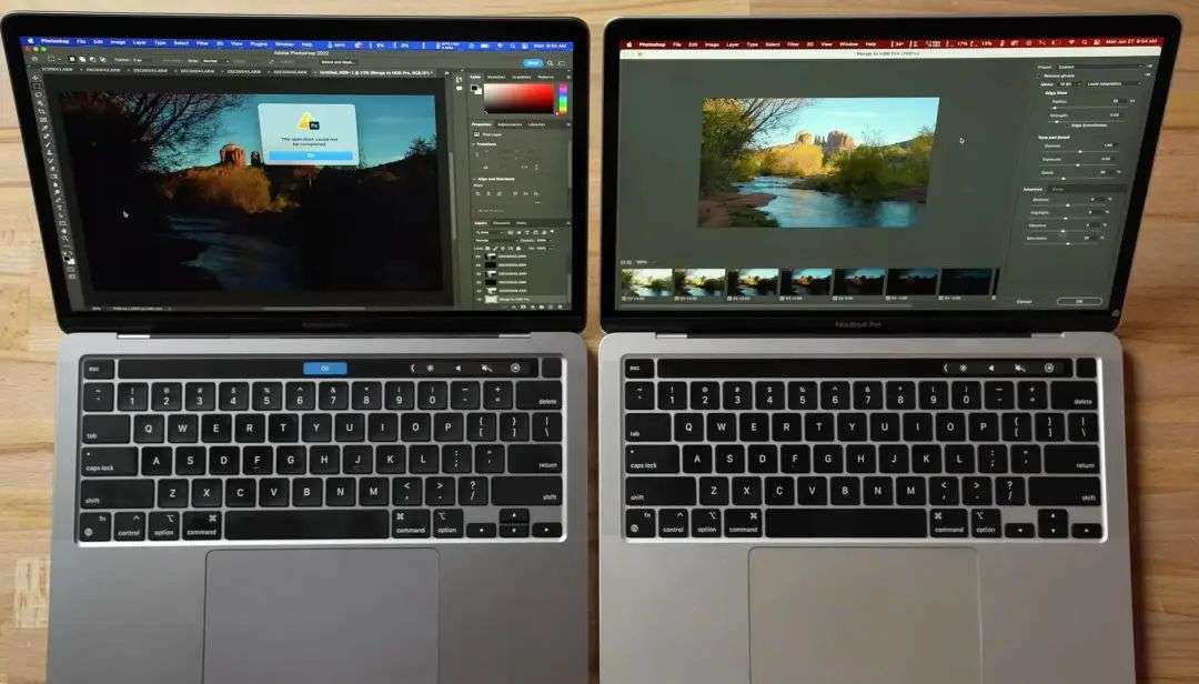 在测试中,无论是用 Lightroom 导出照片,还是导出视频,M2 MacBook Pro 都有着明显的落后,甚至在 Photoshop 里合成 HDR 照片时,直接崩溃。