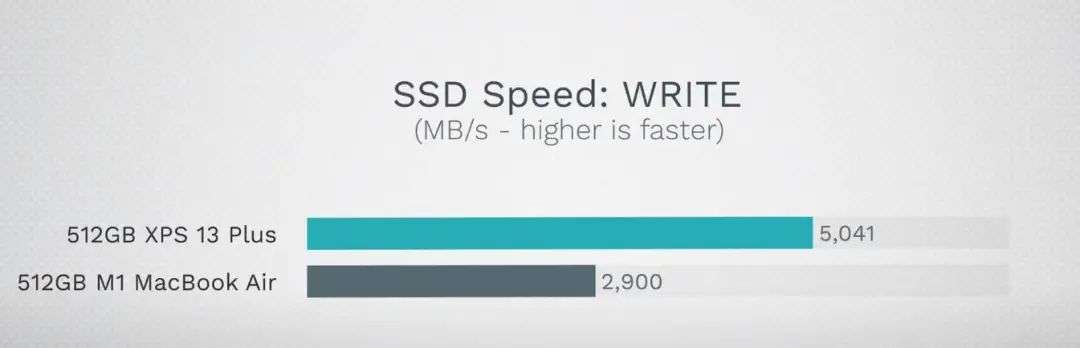 Dell XPS 13 Plus 与 M1 MacBook Air SSD 读写速度对比 图片来自:MaxTech