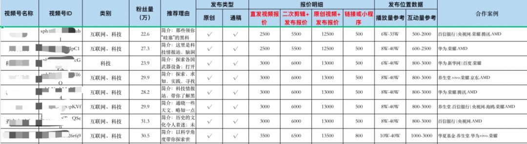 不过,视频号大V主要收入来源以行业头部公司为主,可是大多小打小闹。下图可以看出,一个粉丝量在30万左右的互联网科技类视频号,一条原创视频内容的报价在13000元左右,其合作客户不乏华为、京东、AMD等科技巨头。