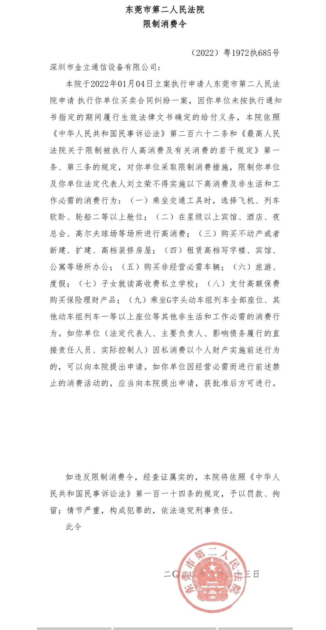而这次判罚结果意味着金立公司的几位责任人,包括董事长刘立荣在内,不能再购买和租赁房屋了。