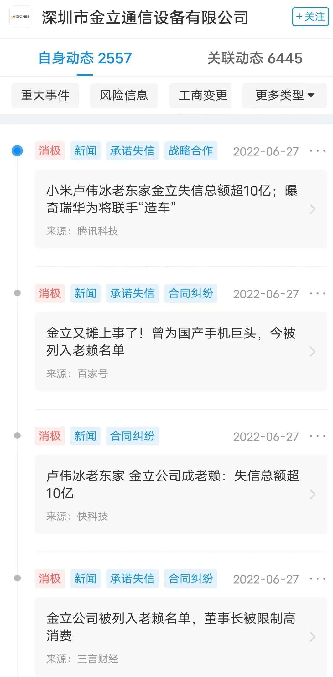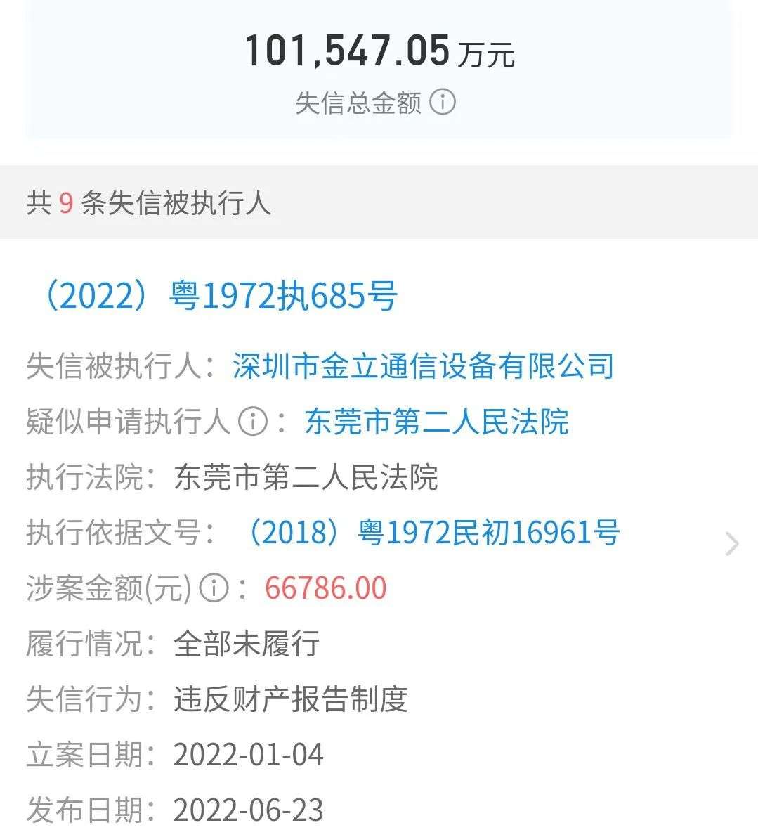 6 月 27 日,企查查 App 显示,深圳市金立通信设备有限公司,简称金立,近日被东莞市第二人民法院列为失信被执行人。