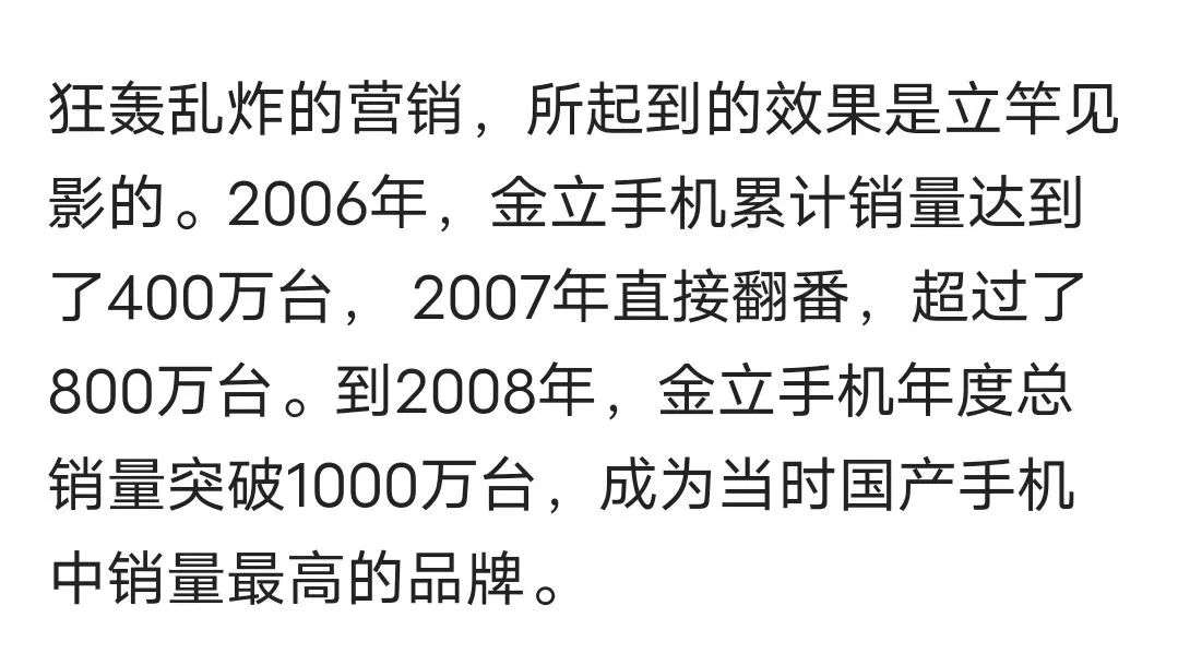 到 2008 年,金立手机年度总销量突破 1000 万台,在那个手机刚刚普及的年代,金立的这个销量已经是相当可观了。