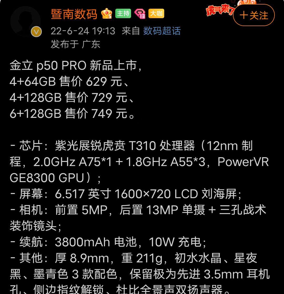 在配置方面,金立 P50 Pro 搭载虎贲 T310 处理器平台,宣称拥有旗舰机性能。