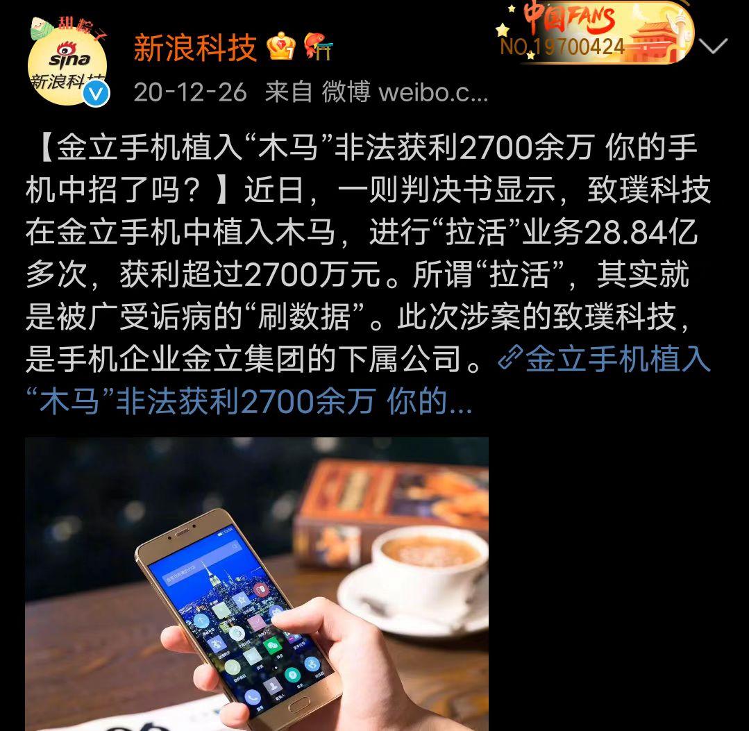 除此之外,当时还有消息说,金立参股的一子公司,通过和其他公司合作,将木马程序植入到约 2652 万台金立手机中,以“拉活”的方式赚钱。