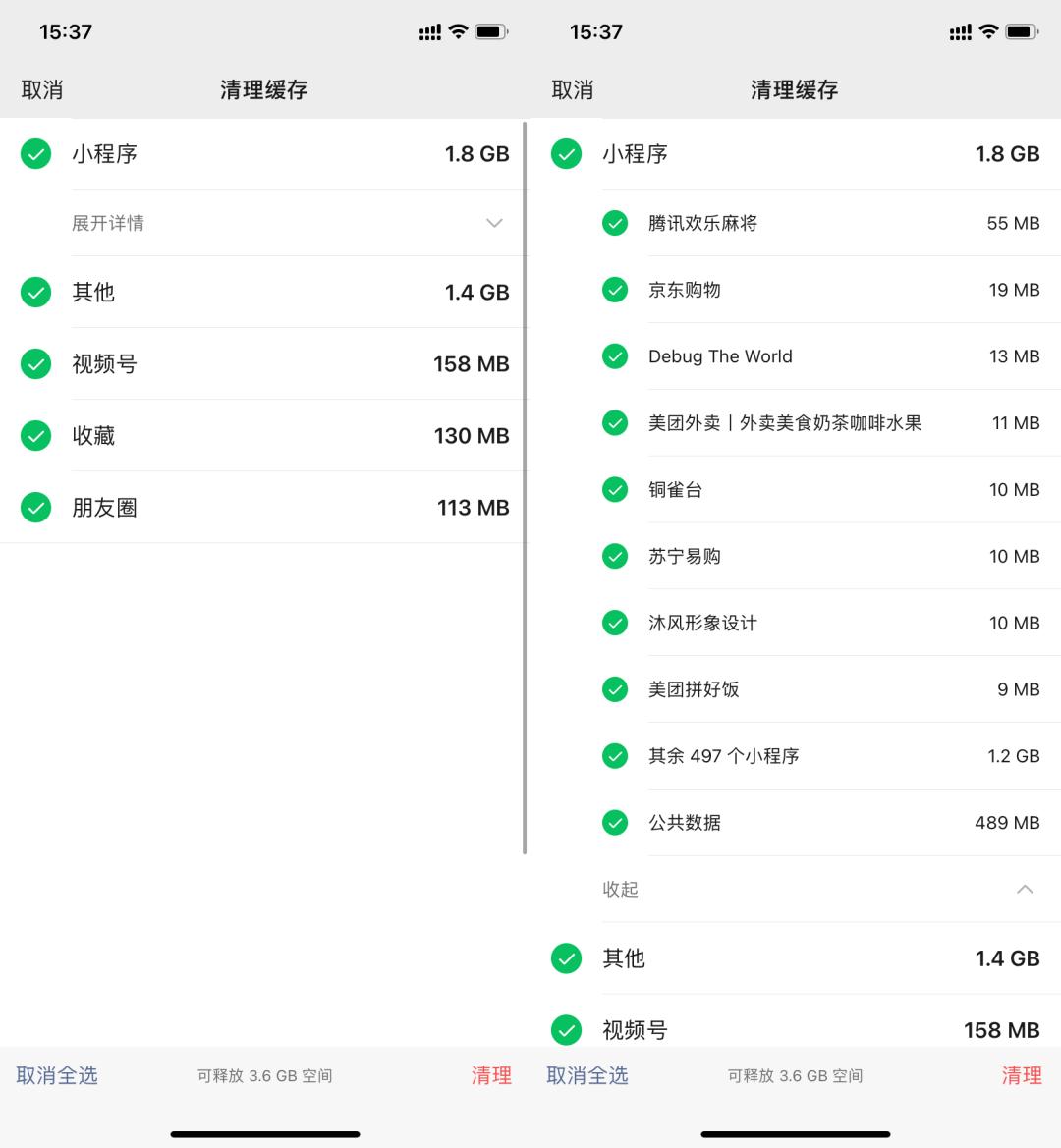 点击 “ 缓存 ” 这个分类,我们可以分别清理小程序、视频号、朋友圈的缓存,甚至还能具体到某一个小程序。
