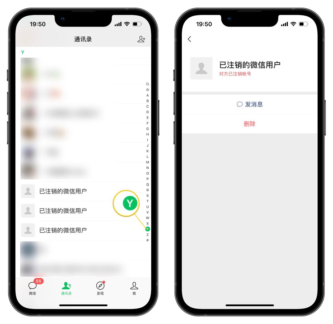 这功能是世超在网上看到的,在通讯录里点击 Y ,就可以找到已注销的好友了。