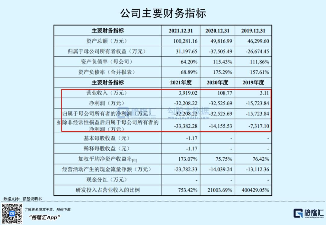 2019年-2021年公司营收分别为3.11万元、108.77万元和3919.02万元,但期间内公司累计亏损8.04亿元,主要是由于公司目前所有的产品均处于研发阶段,还未开展商业化生产及销售。