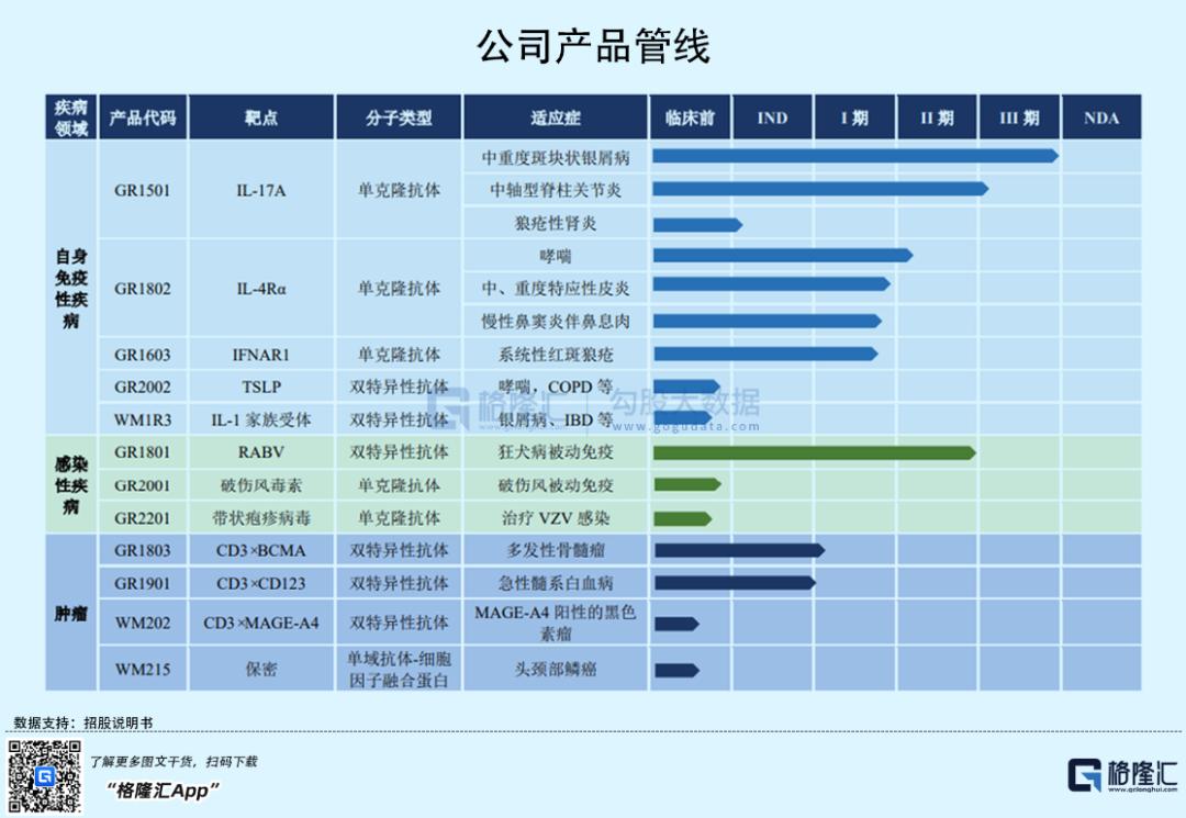 具体来看,公司共有6个双特异性抗体靶点和5个单克隆抗体靶点,在5个处于临床研究阶段的产品中,GR1801、GR1803均为双特异性抗体药物,分别处于II 期、I 期临床阶段,而GR1501、GR1802、GR1603均为单克隆抗体药物,其中GR1501为国内企业中首家进入 III 期临床试验的抗 IL-17 单克隆抗体注射液。