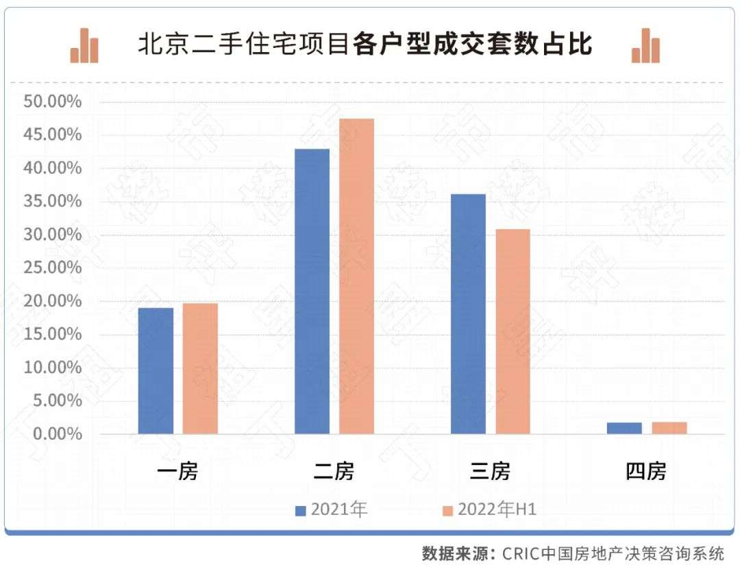 其中,北京、武汉、合肥、重庆4城二房成交结构更加刚需化,两房比重皆明显回升。以北京为例,二手两房的购房门槛相对较低,备受新市民青睐,上半年二房成交比重接近50%,较2021年增长4.51个百分点。