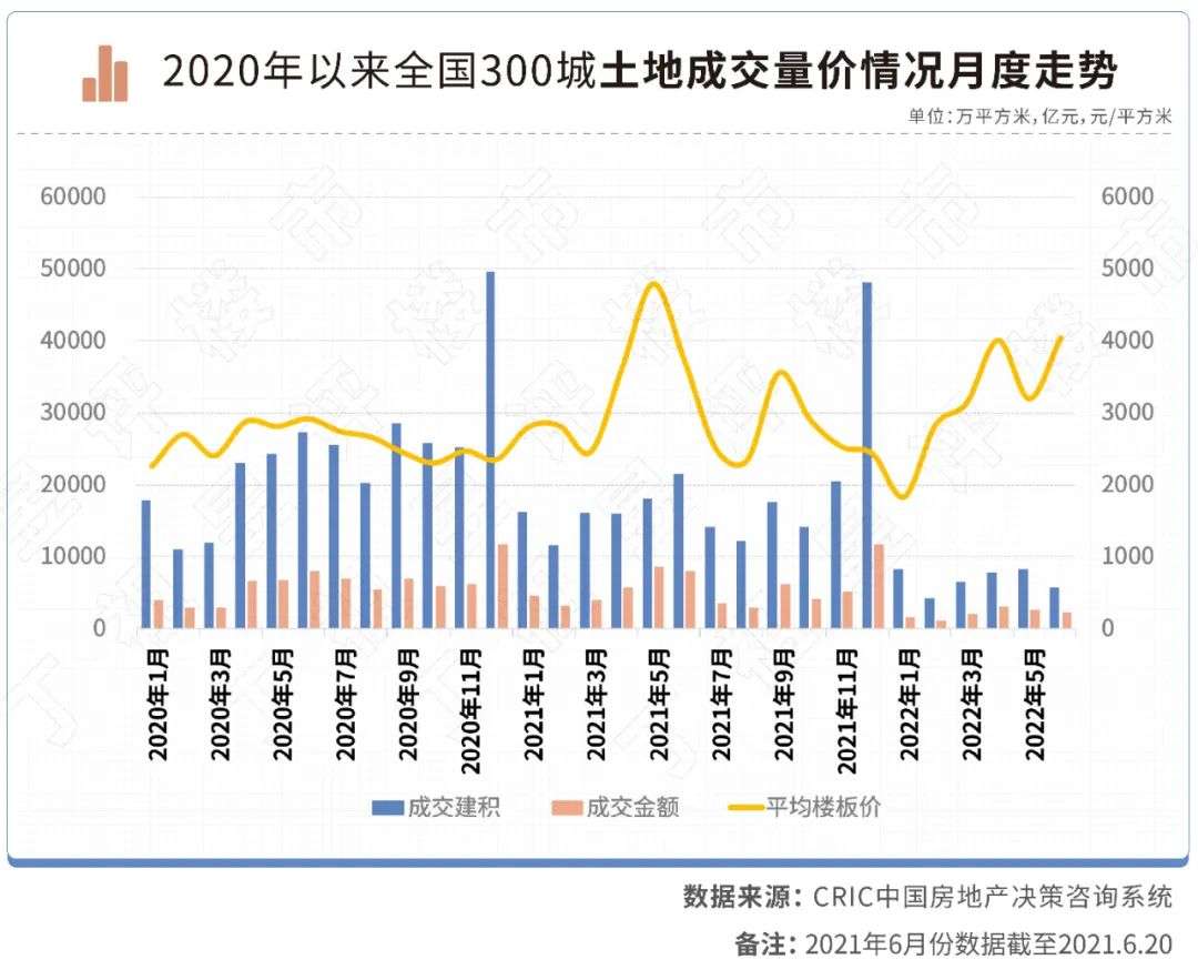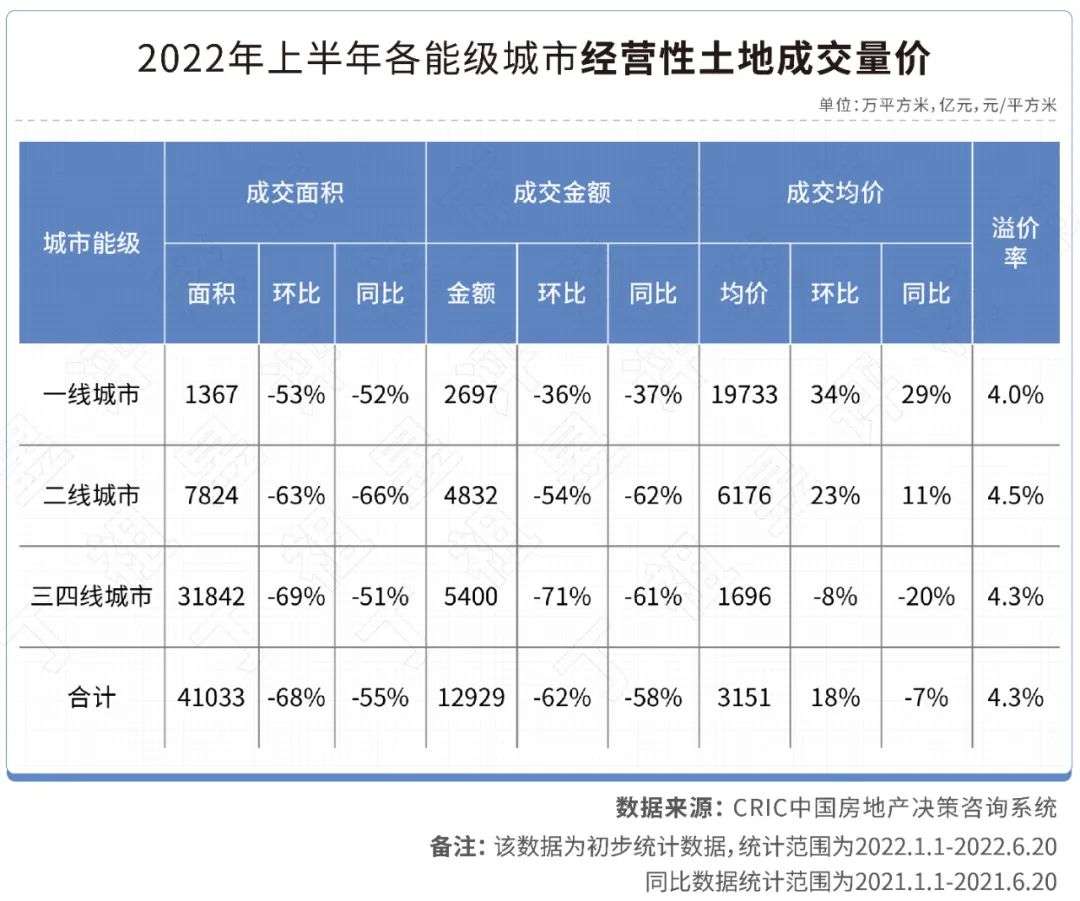 CRIC数据显示,2020年以来一二线城市的平均地价出现了明显抬升,其中一线城市2022年上半年经营性土地成交均价19733元/平方米,同比增长29%,二线城市2022年上半年经营性土地成交均价6176元/平方米,同比增长11%,三四线城市成交均价1696元/平方米,同、环比皆下降。