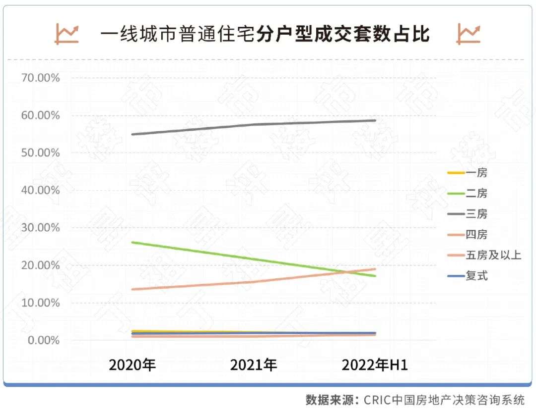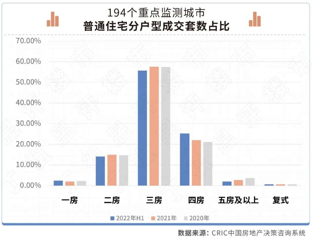 CRIC 数据显示, 2022 年上半年, 194 个重点监测城市普通住宅三房和四房的成交比例达 80% ,面积段也出现了上升,其中 140-180 平方米成交上升最为明显。