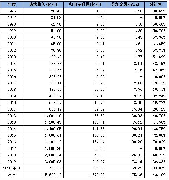 数据统计显示,自1996年上市至2020年(2020年的年度利润分配预案未算在内),格力电器累计实现分红22次,分红总金额达675.66亿元,占期间归母净利润的40%以上。