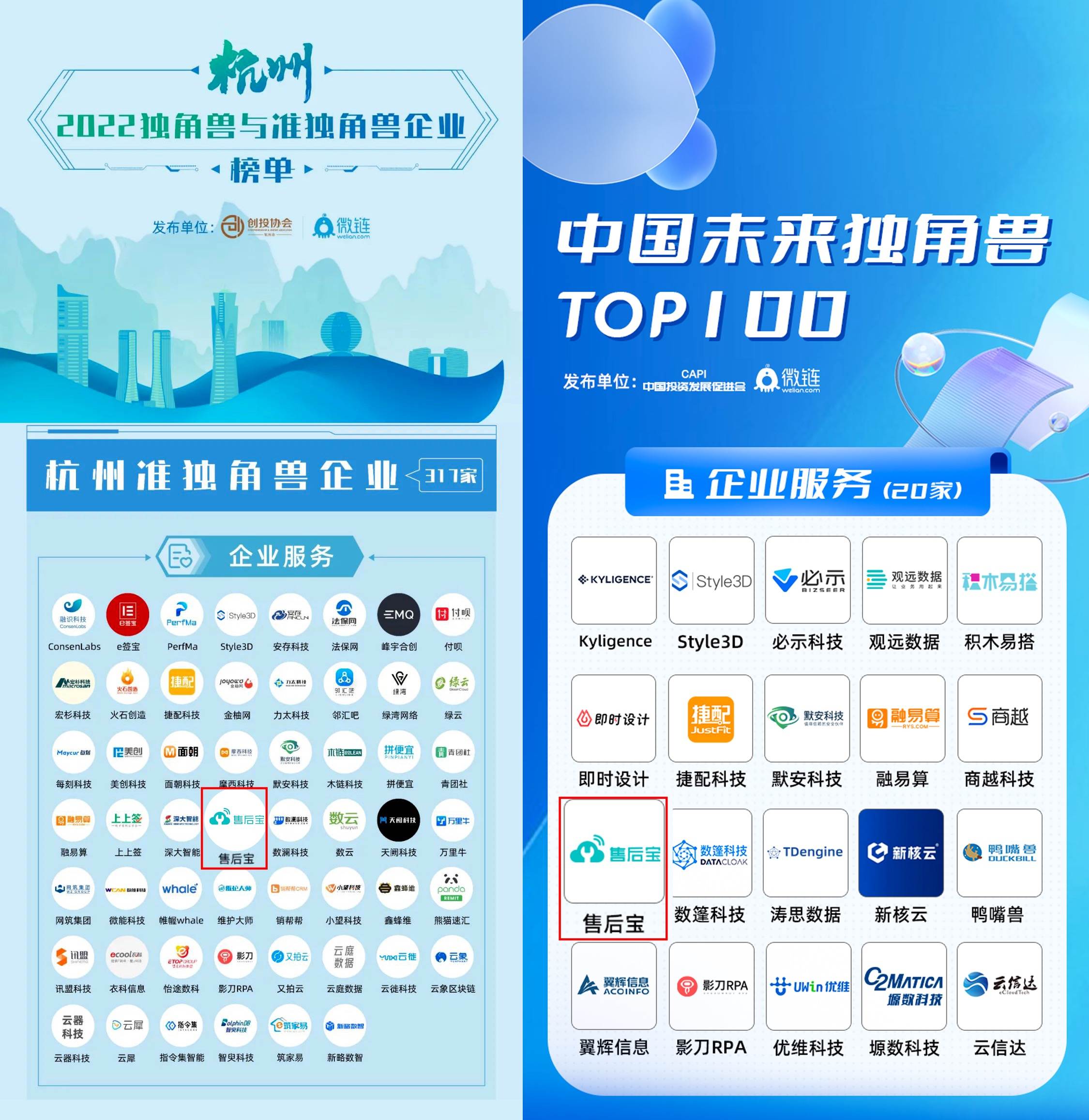 会上,杭州市创业投资协会发布《2022杭州独角兽&准独角兽企业榜单》,中国投资发展促进会发布《中国未来独角兽TOP100》,售后宝凭借着在客户服务领域的创新实力荣登双榜,这也是售后宝再度登榜“准独角兽企业”。