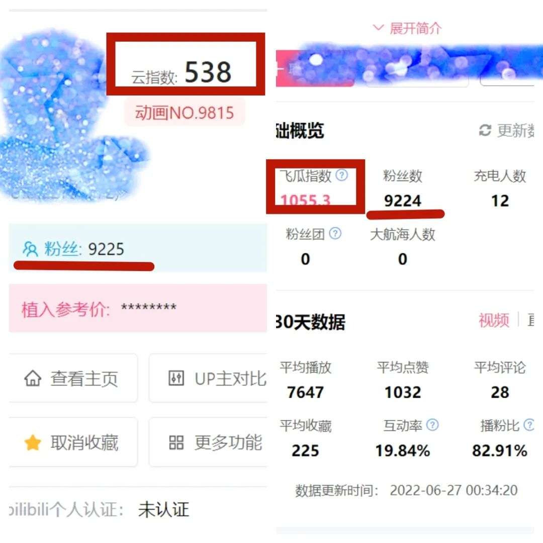 经过部分广告主、UP主的试验比对发现,受粉丝、播放量和三连数据影响,官方植入参考价仍有水分,而且B站中腰头部的UP主中,已签约公司的占据较大部分,阶段性灌数据的现象也常会发生,粉丝数和播放量并不能作为主要参考,能够充分体现一位UP主粉丝黏性和活跃度的是综合数值(火烧云为云指数,飞瓜数据为飞瓜指数)和播粉比。