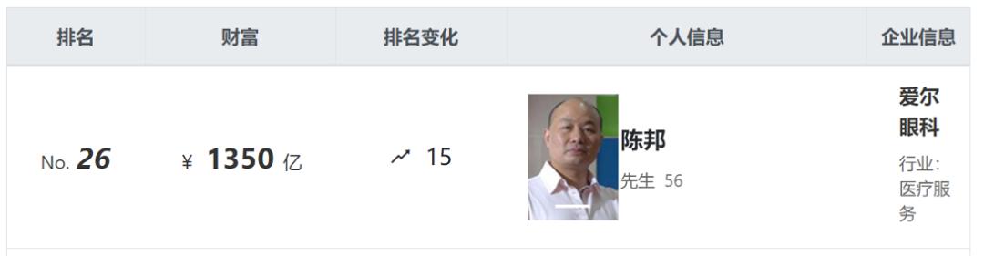 《2016年胡润中国百富榜》中,47岁的陈邦以44亿身价,位列榜单第377位;《2021年胡润中国百富榜》中,56岁的陈邦以1350亿身价,位列榜单第26名,是仅此于智飞生物蒋仁生,医疗行业第二大富豪。