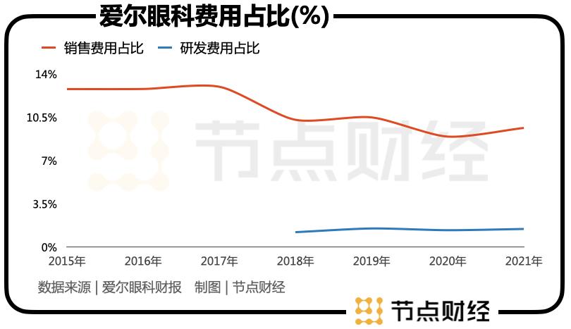 虽然爱尔眼科未对此事进行回应,但探究细节或能管中窥豹。财报显示,公司销售费用占比基本都保持在10%以上,而研发费用占比鲜少超过1.5%。