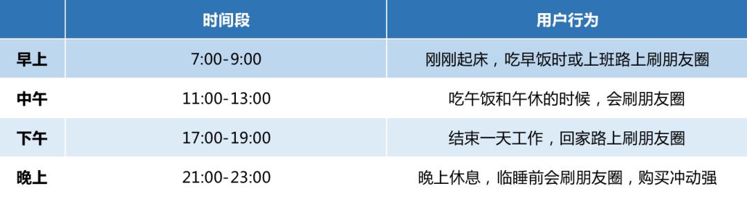 所以要先了解用户刷朋友圈的习惯,选择用户比较空闲的时间段。这里推荐4个发朋友圈的黄金时间段。