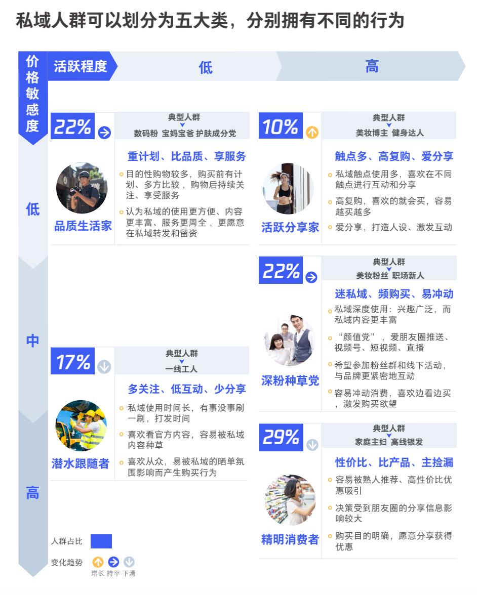据《2021抖音私域经营白皮书》相关调研显示,不同的人群拥有不同的消费行为。例如家庭主妇,决策受到朋友圈的分享信息影响较大,针对这类人群可以多发一些福利诱饵的产品内容。