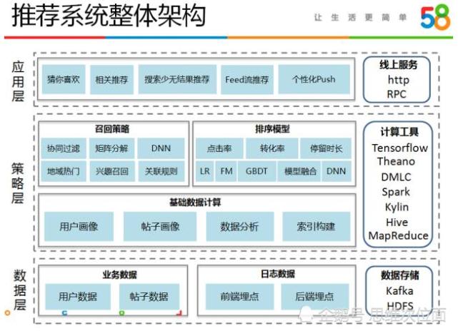 例如租房时,58同城会根据用户的选购条件,例如价格、区位、户型等在数据层做出统计,然后策略层通过对房源特征分类,将每个特征赋予一个权重,再然后通过用户数据与房源特征组合形成召回数据,最终召回数据在应用层优先推荐权重高的召回数据,直至与用户要求完全相违背。