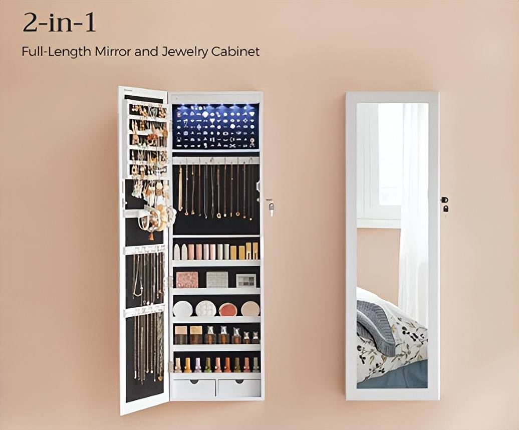 以SONGMICS为例,一款珠宝首饰柜在亚马逊上销量过万,柜子可以简单地挂装在门后或墙上以节省空间,柜门上配有试衣镜,内部还有电池供电的六个LED灯提供照明。这样一款镜子售价约为140美元。