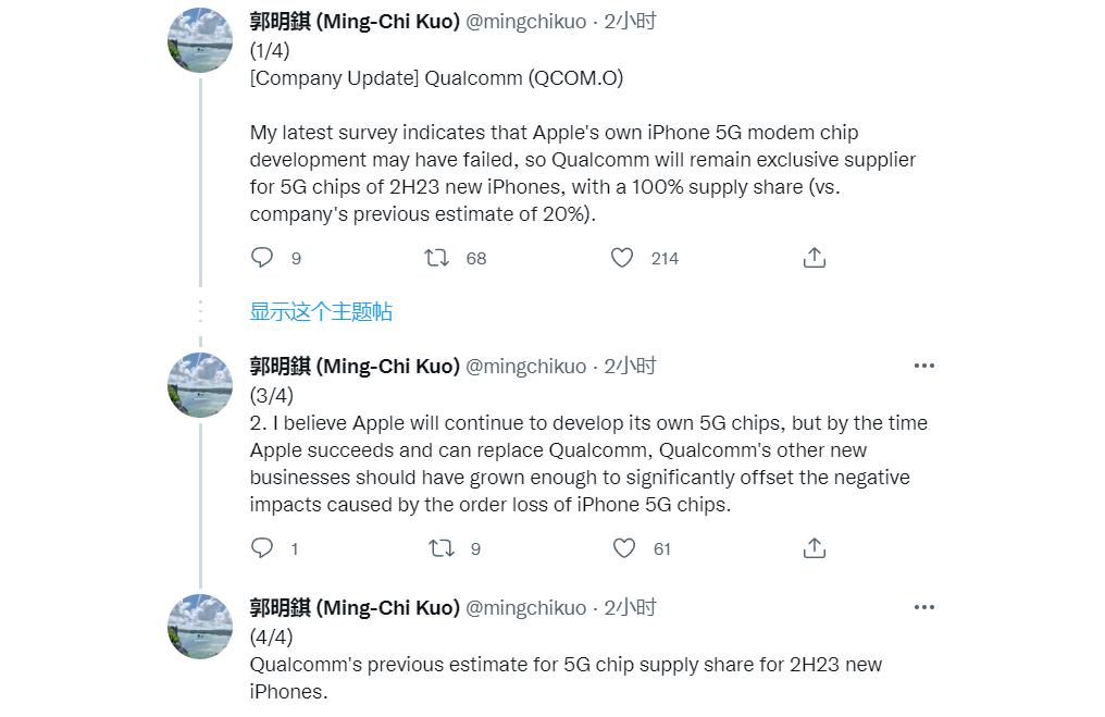 遗憾的是,果粉的基带梦可能不会在短时间内实现了。近日,知名苹果爆料人、天风国际分析师在推特发布爆料,最新调查表明,苹果自己的iPhone 5G基带芯片开发可能已经失败,这意味着高通在2023年下半年仍然会是iPhone唯一的5G基带供应商,供应占比将达100%,而非高通此前预计的20%。
