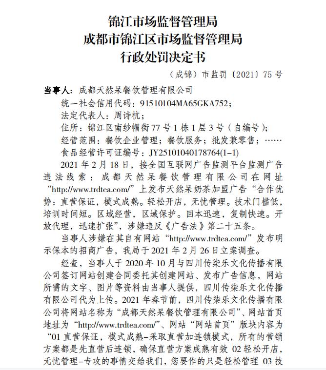 天眼查显示,2021年3月,天然呆因在招商广告中发布“回本迅速,复制快速-迅速回收成本,助您快速积累资金与运营经验,同步积累客户,快速复制新店”的内容系在招商广告中明示保本的行为,违法《广告法》被锦江市场监督管理局罚款5万元。