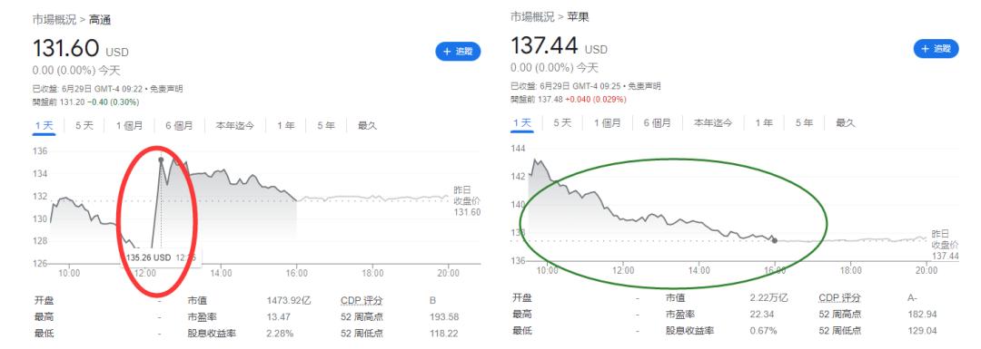 由于这条消息是美股盘中交易时发出的,高通股价噌噌噌就上去了,苹果股价应声下跌。